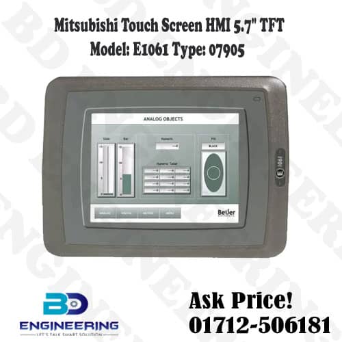 Mitsubishi Electrics HMI E1061 07905 Best price seller in Bangladesh is BD Engineering Solution. Touch Screen E1061 07905 HMI 5.7″ TFT display Mitsubishi GOT2000 HMI also available. The Mitsubishi E1061 contains a 5.7″ touch screen show with 65,536 different color. The center idea of the screen is adaptable showcase blocks. The E1061 can be utilized to supplant a full oversight control center and work impeccably close by the MELSEC scope of regulators.