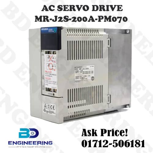 MR-J2S-200A-PM070 price in bd. Moreover, AC SERVO DRIVE MR-J2S-200A-PM070 is available in BD. For instance, Mitsubishi AC Servo Drive POWER is 2kW, INPUT is 3PH+1PH 200-230V, 50/60Hz. The MR-J2S-A series takes place with both analog and digital inputs. Therefore, it is very good for all types of single-axis applications those are from take-over speed to torque control.