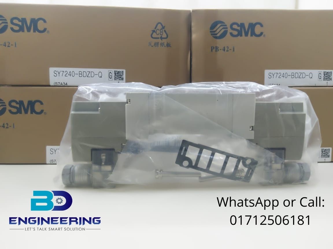 SMC Solenoid valve SY7240-BDZD-Q air control 24V DC Valve. The brand is SMC Solenoid air control SY7240-BDZD-Q providing all over Bangladesh by BD Engineering Solution. The SMC SY7240-BDZD-Q is a 5-port solenoid valve from SMC’s SY7000 series, designed for efficient air control in pneumatic systems. This model features a double solenoid configuration, operates on a 24V DC supply