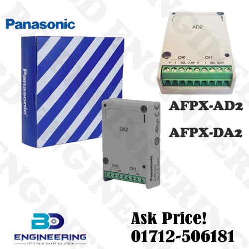 Panasonic AFPX-DA2 Analog Input Output Cassette’s best price seller in Bangladesh is BD Engineering Solution. The Professional range of PLCs can provide the user with a secure, high-powered unit with exceptional expandability options. APFX programmable controllers offer a Servo and Stepper motor control solution with diverse control options. These applications in mind the AFPX series of general purpose PLC which is well suited for small-scale equipment control enabling multi-axis control.